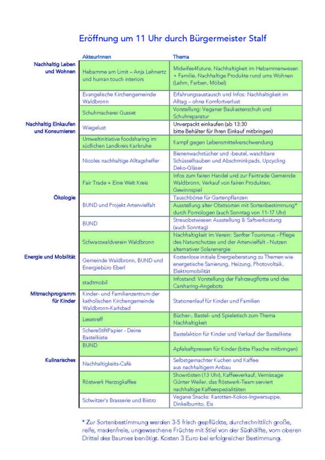 Am Samstag, den 24.09 findet ab 11 bis 17 Uhr die Veranstaltung im Kurhaus Waldbronn statt. Sie dürfen sich auf Aktionen wie Apfelpressen, Tauschbörse für Gartenpflanzen, Erfahrungsaustausche zum nachhaltigen Alltag ohne Komfortverlust und vieles mehr freuen.