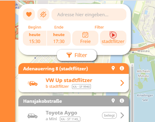 Alles auf einen Blick: Die neuen Quick Filter ermöglichen es, freie Fahrzeuge mit nur einem Klick anzeigen zu lassen. Das Bediengebiet und die stadtflitzer werden auf diese Weise ebenfalls sichtbar.
