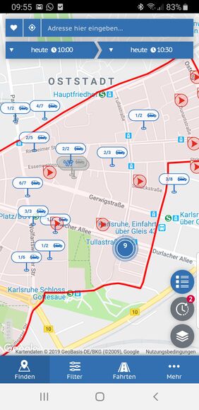Nach dem Einloggen, wird auch das stadtflitzer-Bediengebiet rot hinterlegt und verfügbare stadtflitzer werden angezeigt.