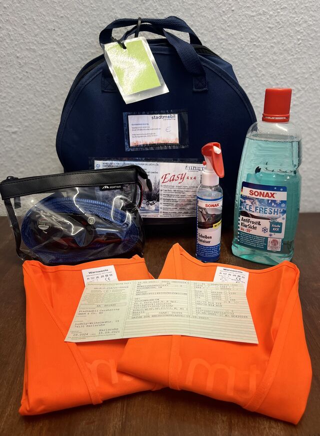 In unserem Büro erhalten Sie auf Anfrage kostenfrei den originalen Fahrzeugschein, Warnwesten oder Spanngurte. Falls nötig, können Sie auch gerne Schneeketten für verschiedene Fahrzeugtypen für 20€ pro Buchung erhalten. Für Fahrten innerhalb von Deutschland genügt die Kopie des Fahrzeugscheins. Diese finden Sie im Tankmäppchen, zusammen mit dem grünen Versicherungsschein. Bei längeren Buchungen erhalten Sie zusätzlich eine stadtmobil Tasche mit Scheibenenteiser, Reinigungstücher und Müllbeuteln dazu.