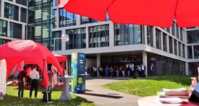 Der Mobilitätstag wird durch die Hausleitung der AOK Baden-Württemberg eröffnet. Mitarbeitende können sich an verschiedenen Ständen über Mobilitätsangebote informieren.