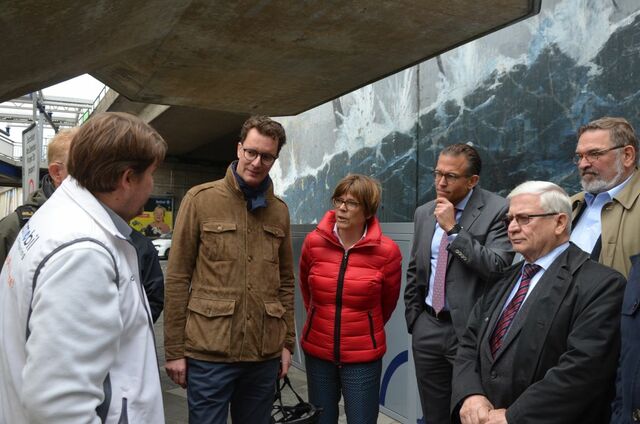 Viel Besuch an der Mobilstation in Essen-Stele: Am Dienstag besuchte der NRW Verkehrsminister Hendrik Wüst mit einer Delegation die Mobilstation und ließ sich von Ruhrbahn Vorstand Michael Feller und stadtmobil Geschäftsführer Matthias Kall die Angebote erklären.