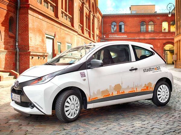 Stellplätze im öffentlichen Straßenland, gekennzeichnet mit einem Verkehrschild "Carsharing Stellplatz" und „stadtmobil CarSharing“.