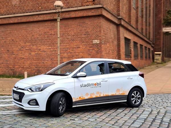 Stellplätze im öffentlichen Straßenland, gekennzeichnet mit einem Verkehrschild "Carsharing Stellplatz" und „stadtmobil CarSharing“.